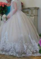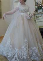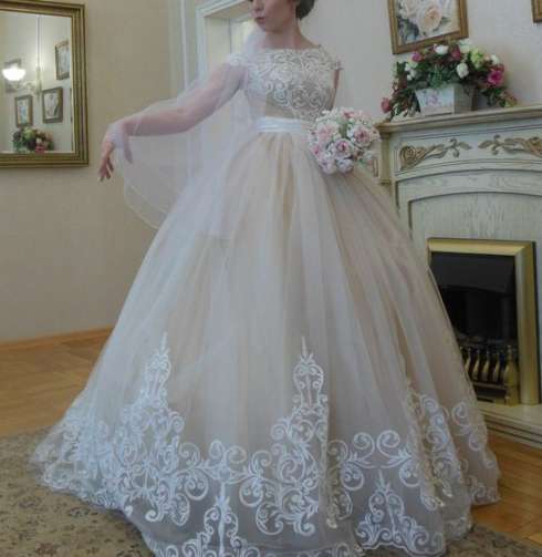 Красивое платье цвета капучино, верх и низ расшиты кружевом. Без корсета, застегивается на пуговички "жемчужинки", 5 юбок. Верх платья прозрачный и поэтому одевается на боди бежевого цвета. Платье и боди одевалось 1 раз. После химчистки. Данное платье из коллекции "Bohemia" 2016 года. + боди к платью и чехол для платья. Возможен торг.