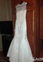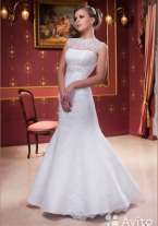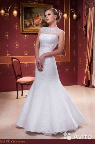 Красивое дорогое кружево, фасон рыбка, если одеть с кольцами будет пышнее, на спине вырез, очень удобное. Цвет айвори. Подшито под рост 158 + каблук 12 см. Скину еще 1500 на химчистку.